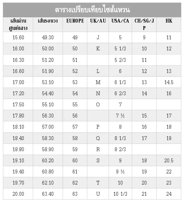 นำขนาดเส้นผ่านศูนย์กลางที่ได้มาเปรียบเทียบตามตารางเทียบไซส์แหวนด้านล่าง