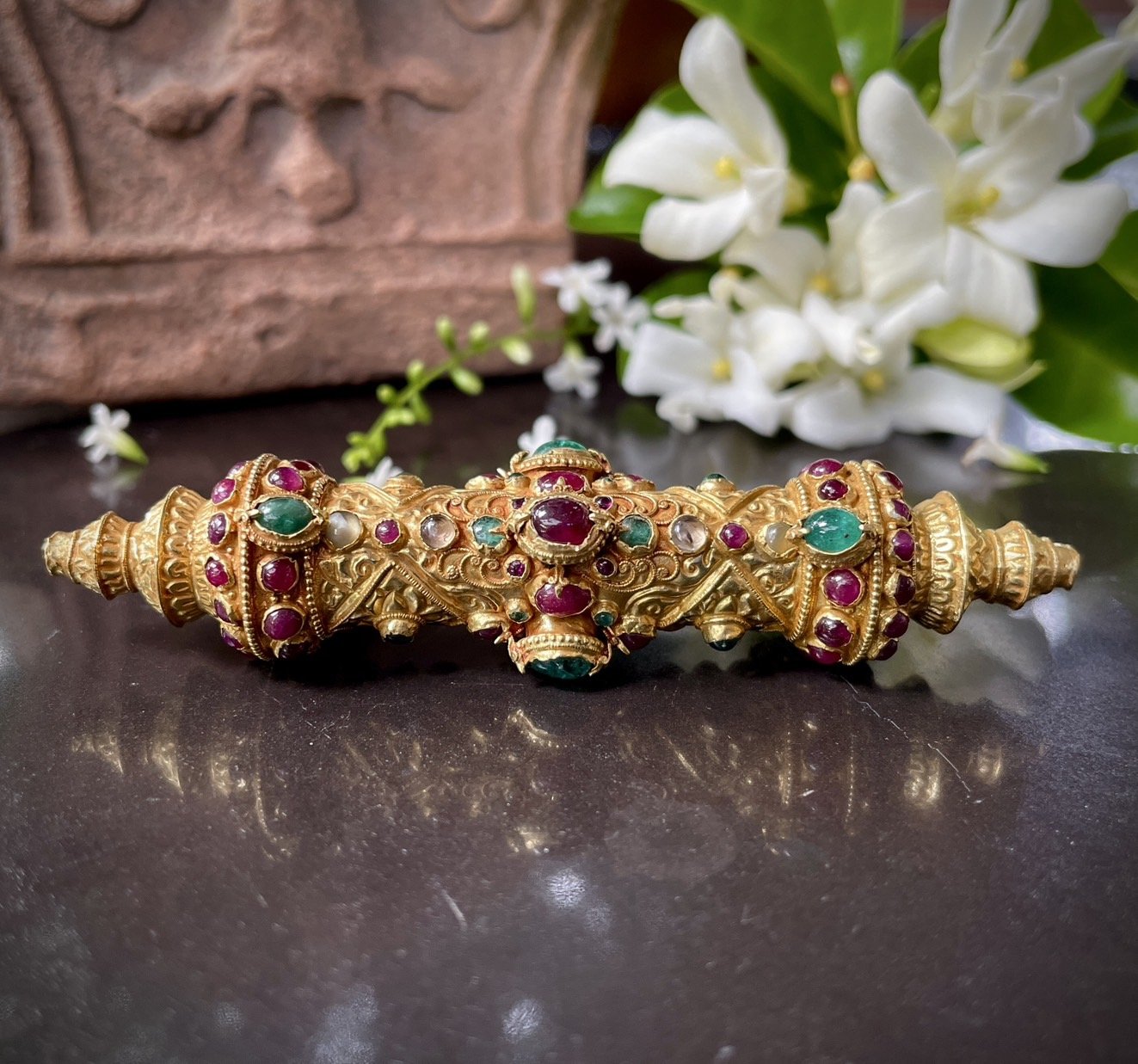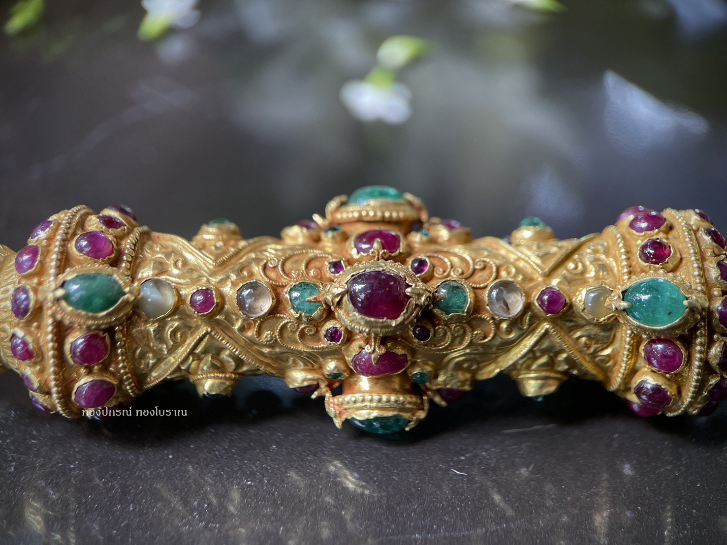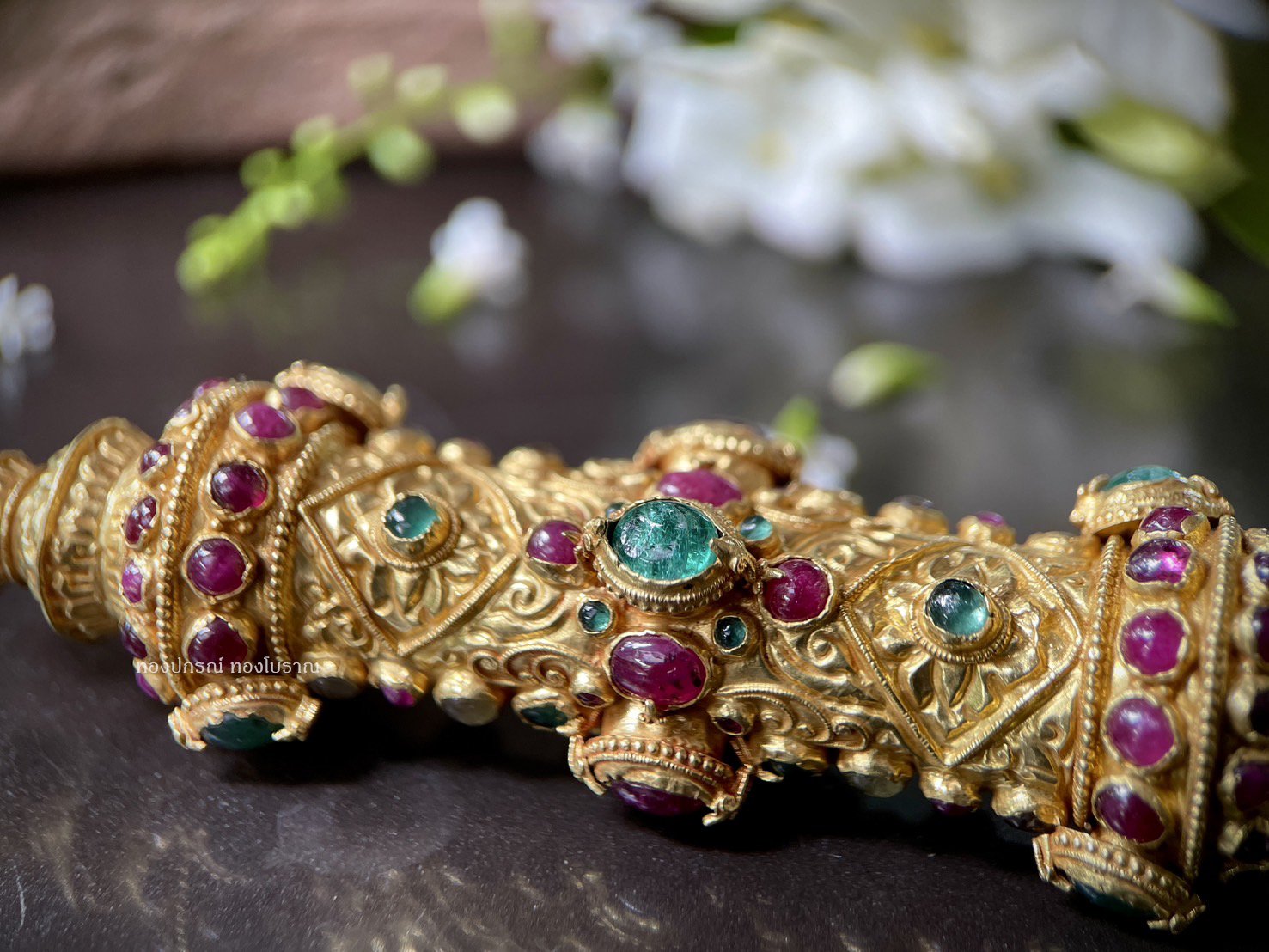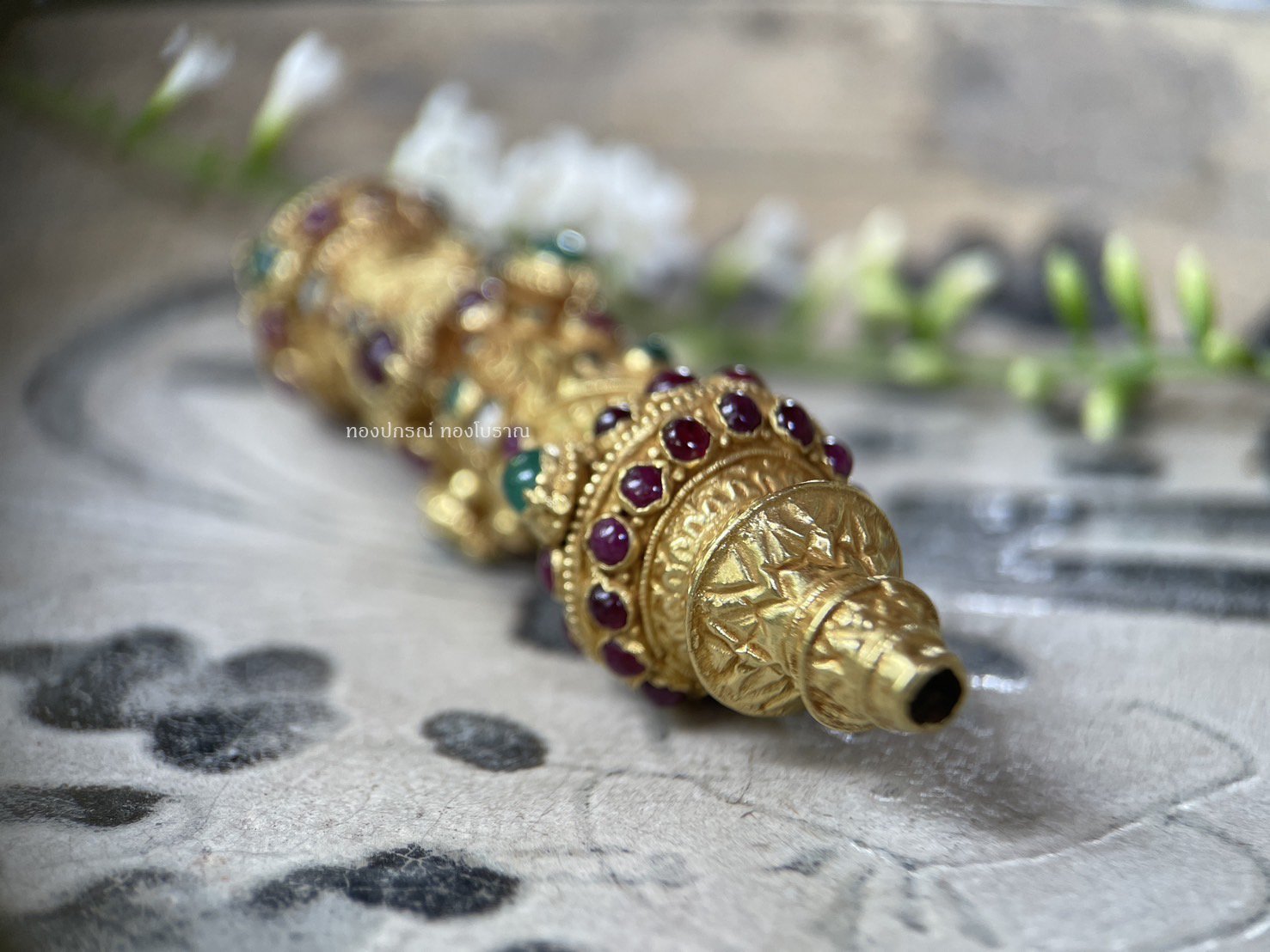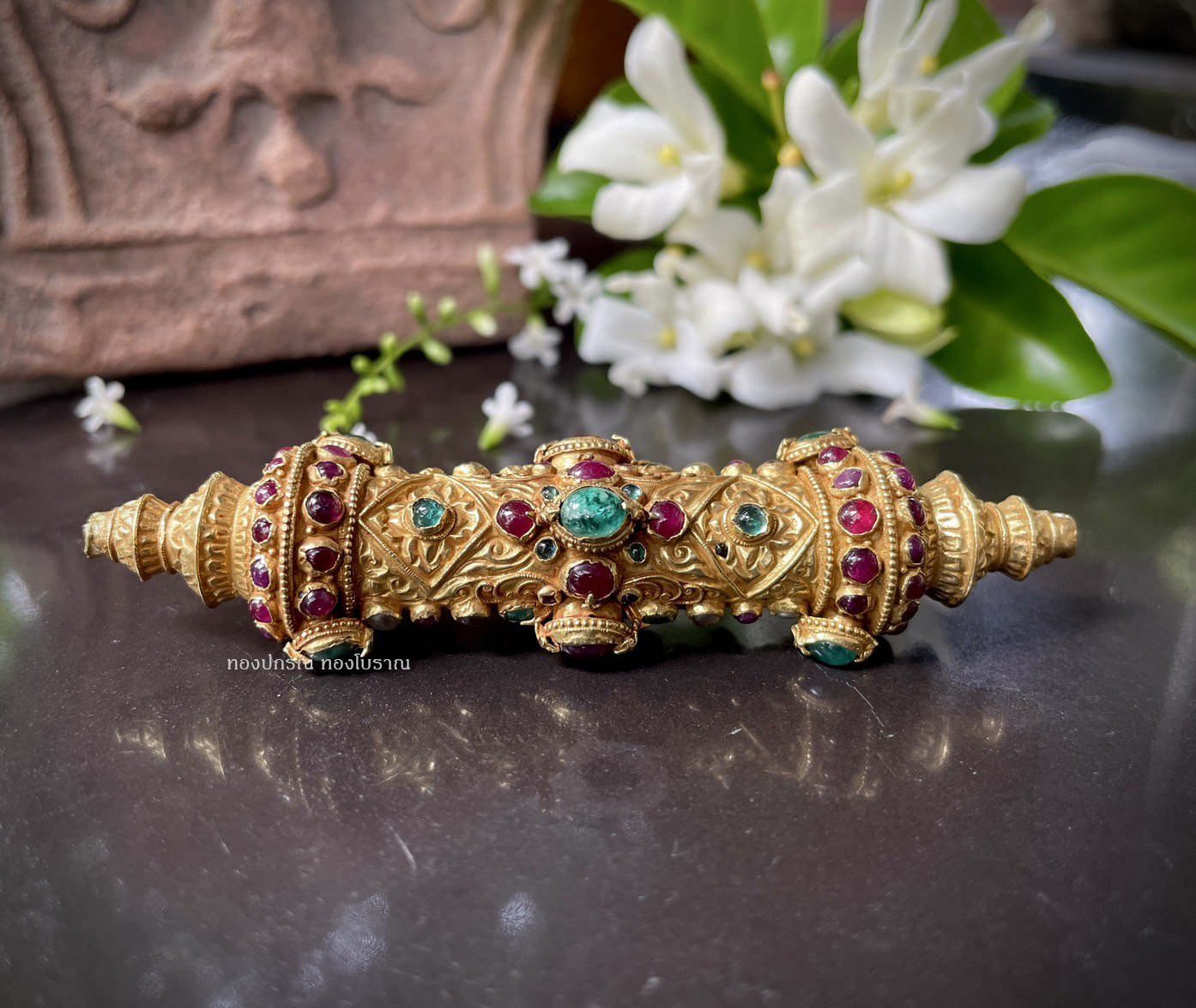 The continuous surface on both front and back is further embellished with gemstones ruby, emerald, and yellow sapphire like a universe radiating energy from its center to the four directions. The ends of the Takrut are engraved with petal-like motifs, symbolizing blooming from within,