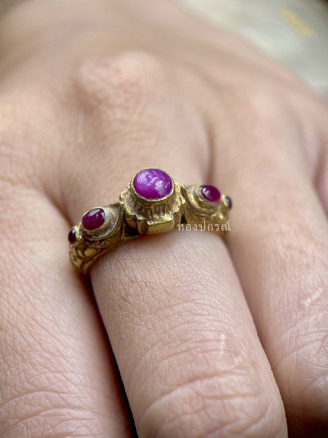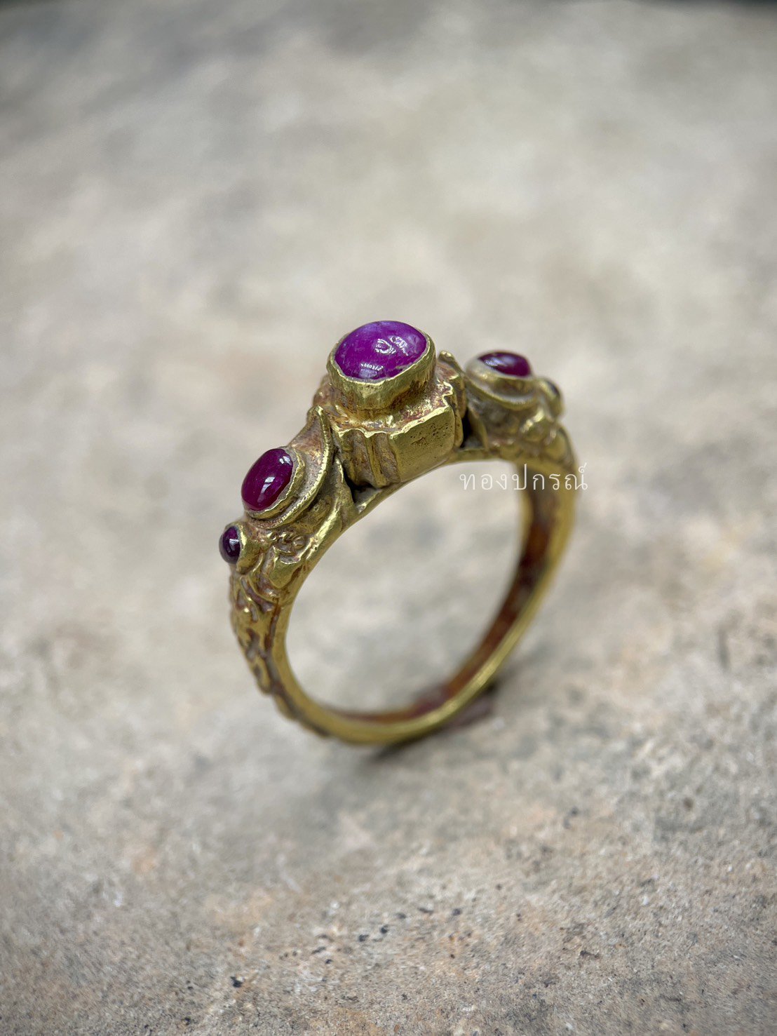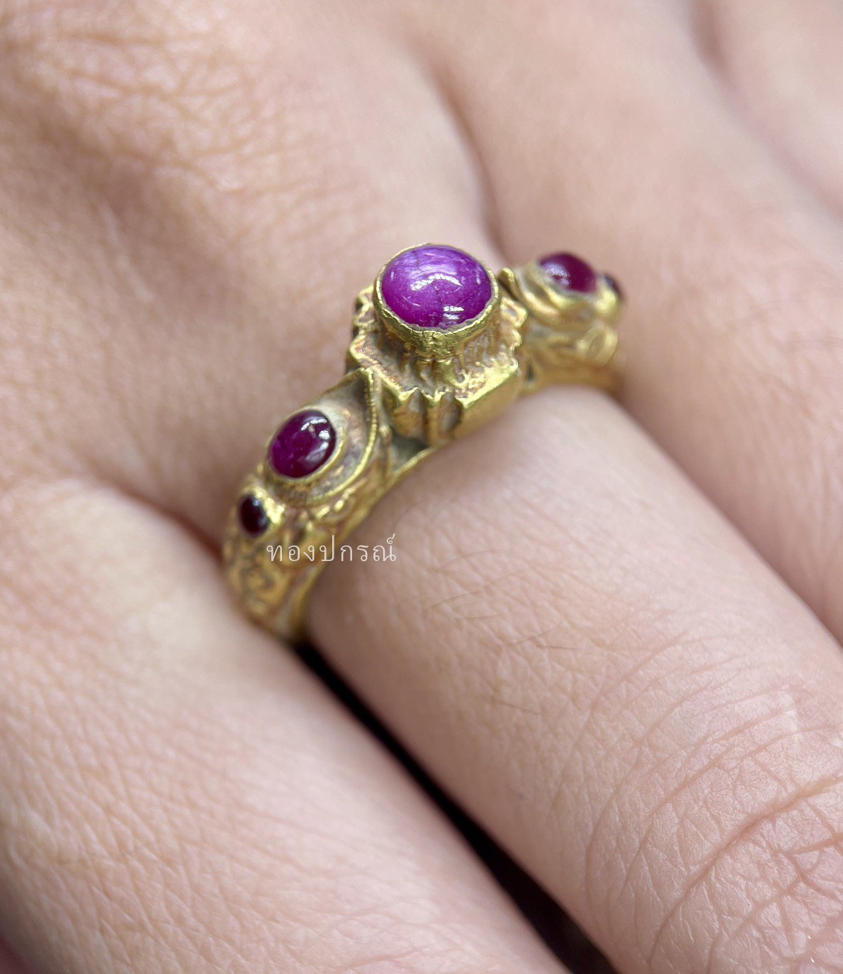 ✨ ส่วนขาแหวนที่โค้งพริ้วคล้ายงู คือเอกลักษณ์ของงานช่างโบราณที่ได้รับแรงบันดาลใจจาก “นาค” สัญลักษณ์แห่งการคุ้มครองและความอุดมสมบูรณ์ เมื่อนำมาเข้าคู่กับทับทิมสีแดงเข้ม จึงยิ่งเสริมพลังแห่งความรุ่งเรืองและความกล้าหาญตามคติไทยดั้งเดิม ลวดลายที่ตอกสลักเต็มวงและการเรียงพลอยอย่างประณีต ช่วยทำให้แหวนวงนี้ไม่ใช่เพียงเครื่องประดับ แต่เป็น “ชิ้นงานศิลป์ที่พกพาได้” สำหรับคนที่รักงานเก่ามีเรื่องราว วงแบบนี้…คือหนึ่งในรูปทรงที่หาไม่ได้บ่อยนัก และยิ่งเวลาผ่านไป ก็ยิ่งมีคุณค่า หากคุณชอบเครื่องประดับที่เล่าเรื่องสถาปัตยกรรมไทยได้ในตัว วงนี้อาจเป็นหนึ่งในชิ้นที่ “เรียกหาเรา” อยู่ก็ได้ค่ะ