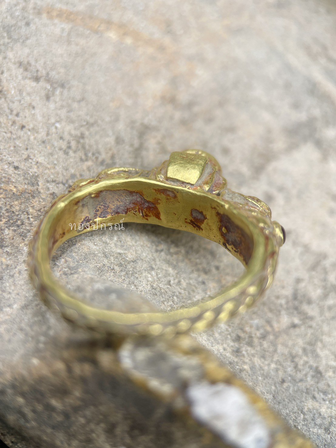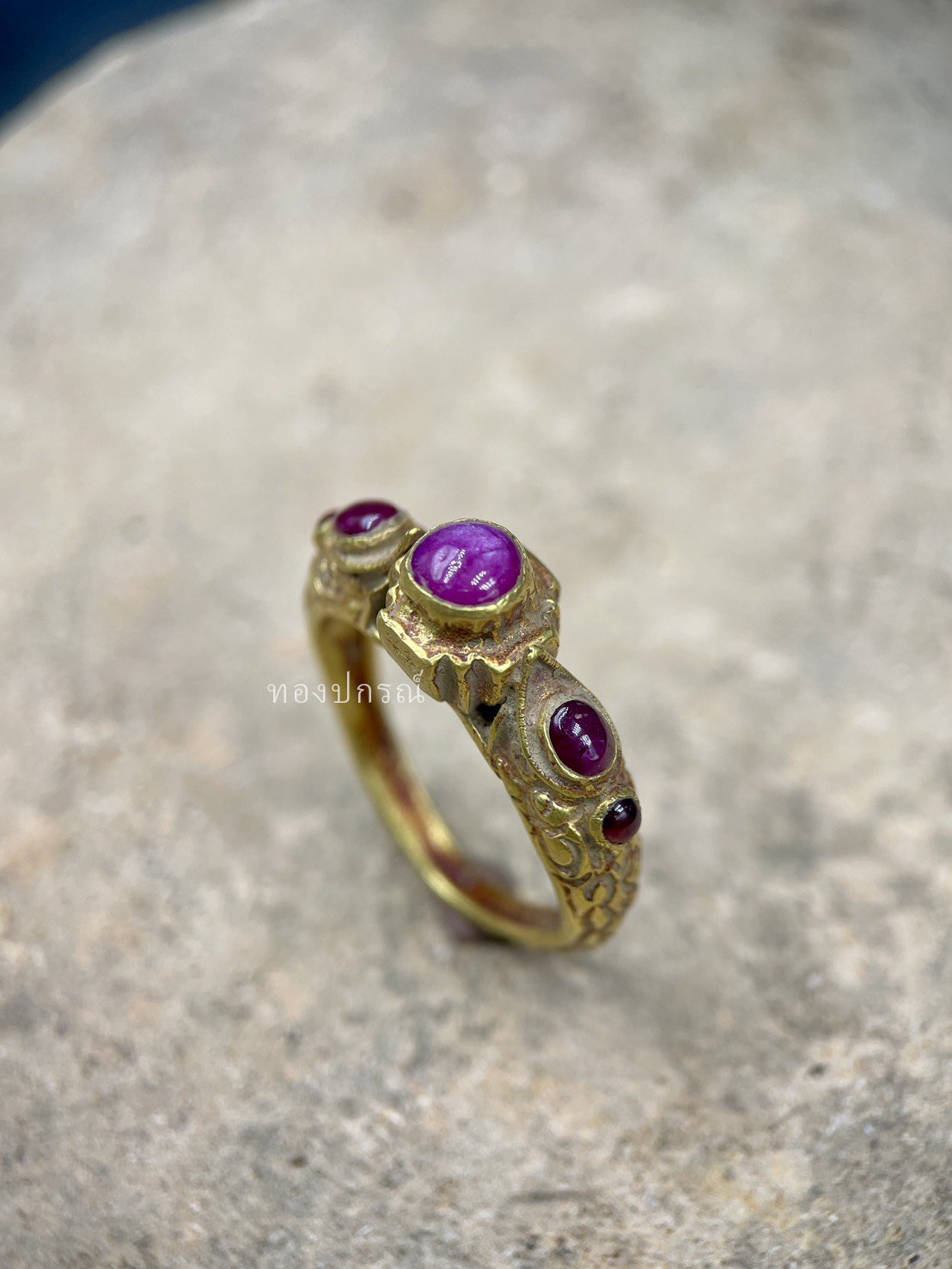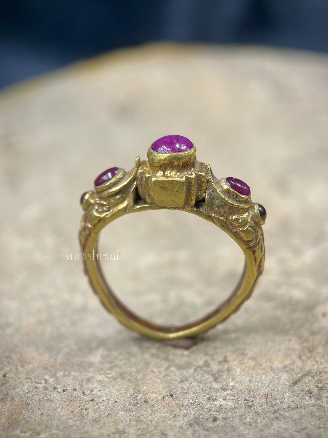 ✨ ส่วนขาแหวนที่โค้งพริ้วคล้ายงู คือเอกลักษณ์ของงานช่างโบราณที่ได้รับแรงบันดาลใจจาก “นาค” สัญลักษณ์แห่งการคุ้มครองและความอุดมสมบูรณ์ เมื่อนำมาเข้าคู่กับทับทิมสีแดงเข้ม จึงยิ่งเสริมพลังแห่งความรุ่งเรืองและความกล้าหาญตามคติไทยดั้งเดิม ลวดลายที่ตอกสลักเต็มวงและการเรียงพลอยอย่างประณีต ช่วยทำให้แหวนวงนี้ไม่ใช่เพียงเครื่องประดับ แต่เป็น “ชิ้นงานศิลป์ที่พกพาได้” สำหรับคนที่รักงานเก่ามีเรื่องราว วงแบบนี้…คือหนึ่งในรูปทรงที่หาไม่ได้บ่อยนัก และยิ่งเวลาผ่านไป ก็ยิ่งมีคุณค่า หากคุณชอบเครื่องประดับที่เล่าเรื่องสถาปัตยกรรมไทยได้ในตัว วงนี้อาจเป็นหนึ่งในชิ้นที่ “เรียกหาเรา” อยู่ก็ได้ค่ะ
